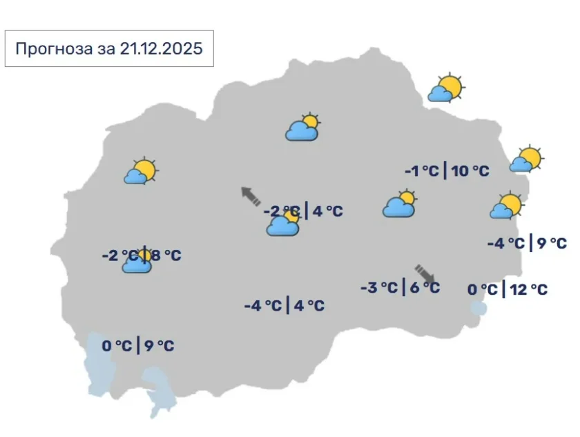 Сончево со мала до умерена облачност и со слаб променлив ветер. Во поголем дел од денот по одделни котлини ќе има појава на магла. Максималната температура ќе биде во интервал од 8°C до 12°C, а во местата со магла од 2°C до 4 °C.